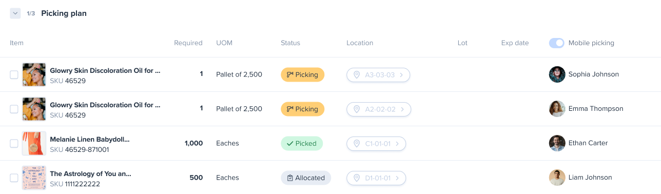 - Editing Location Assignments: Before making the inventory transfer, indicating that the picking is complete, you can edit the assigned locations. Editing and re-assigning new locations will require reprinting the picking list.