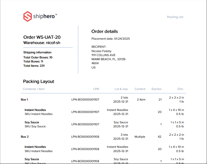 - Packing layout details (boxes, pallets, content description)