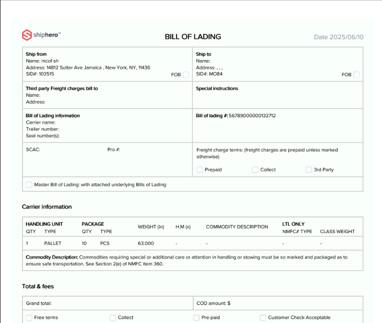 Once an order reaches Packed status, users can generate a native Bill of Lading (BOL) PDF that complies with VICS BOL Creation standards.