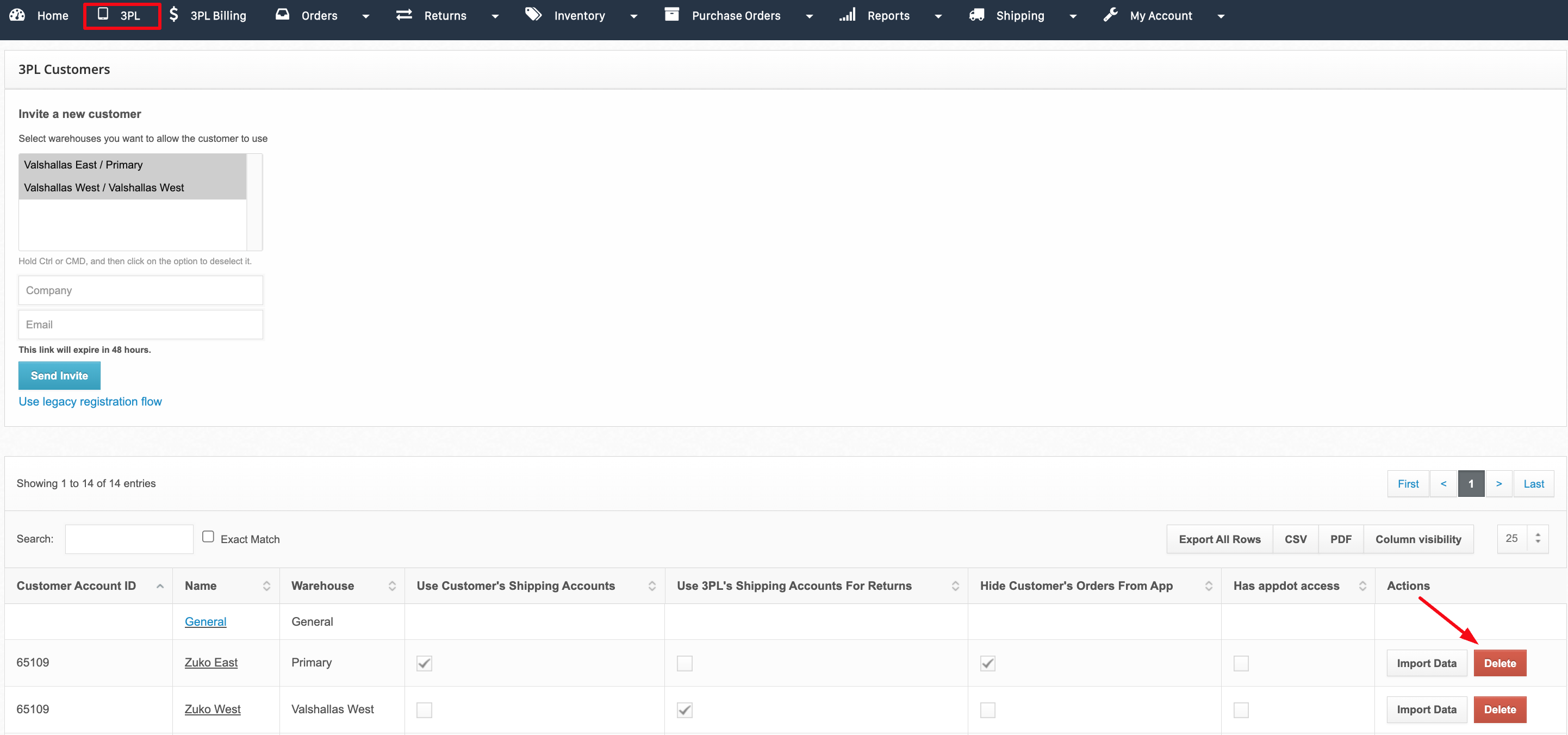 - Click the Delete button in the Action column on the 3PL Customer page to remove the incorrect warehouse.
